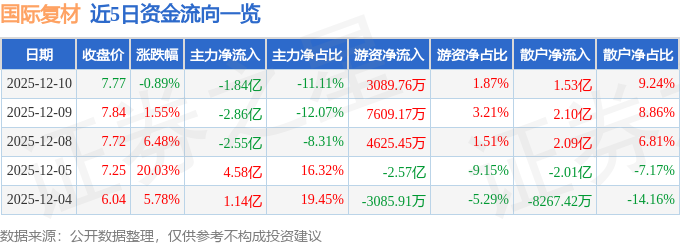 证券之星消息,截至2025年12月10日收盘,国际复材(301526)报收于7.77元,下跌0.89%,换手率15.1%,成交量212.07万手,成交额16.52亿元。