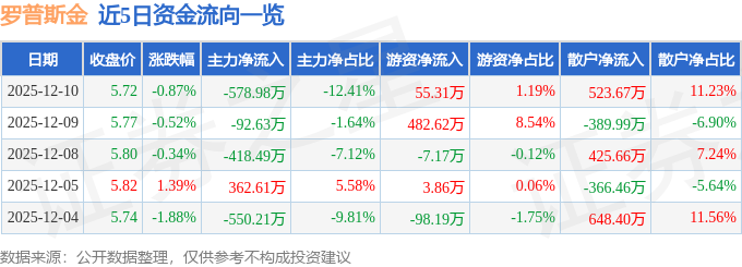 12月10日的资金流向数据方面,主力资金净流出578.98万元,占总成交额12.41%,游资资金净流入55.31万元,占总成交额1.19%,散户资金净流入523.67万元,占总成交额11.23%。