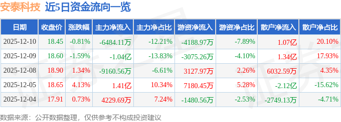 证券之星消息,截至2025年12月10日收盘,安泰科技(000969)报收于18.45元,下跌0.81%,换手率2.8%,成交量28.95万手,成交额5.31亿元。