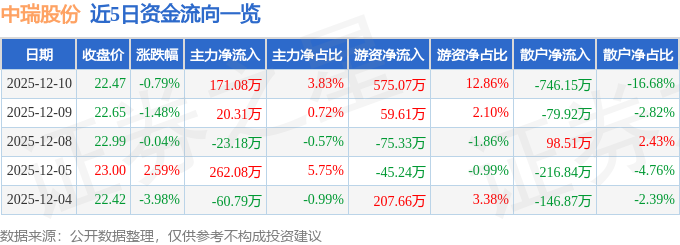 证券之星消息,截至2025年12月10日收盘,中瑞股份(301587)报收于22.47元,下跌0.79%,换手率2.69%,成交量1.98万手,成交额4472.0万元。