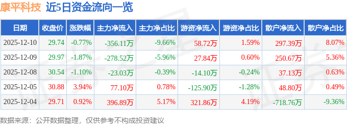 证券之星消息,截至2025年12月10日收盘,康平科技(300907)报收于29.74元,下跌0.77%,换手率1.29%,成交量1.24万手,成交额3686.04万元。