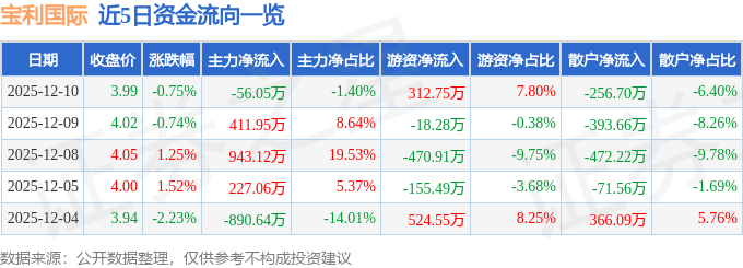 证券之星消息,截至2025年12月10日收盘,宝利国际(300135)报收于3.99元,下跌0.75%,换手率1.09%,成交量10.02万手,成交额4010.4万元。