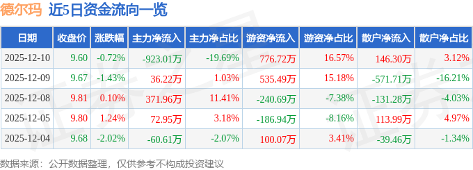 证券之星消息,截至2025年12月10日收盘,德尔玛(301332)报收于9.6元,下跌0.72%,换手率1.84%,成交量4.87万手,成交额4688.7万元。