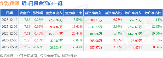 证券之星消息,截至2025年12月10日收盘,华数传媒(000156)报收于7.62元,下跌0.26%,换手率0.35%,成交量6.0万手,成交额4578.07万元。