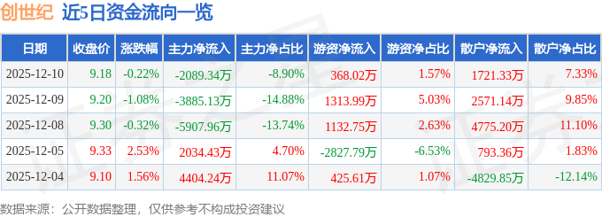 12月10日的资金流向数据方面,主力资金净流出2089.34万元,占总成交额8.9%,游资资金净流入368.02万元,占总成交额1.57%,散户资金净流入1721.33万元,占总成交额7.33%。