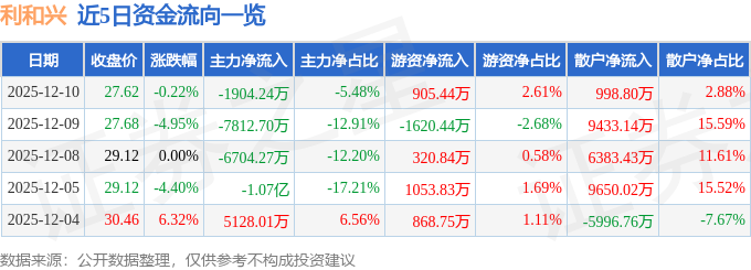 证券之星消息,截至2025年12月10日收盘,利和兴(301013)报收于27.62元,下跌0.22%,换手率6.65%,成交量12.59万手,成交额3.47亿元。