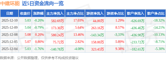 证券之星消息,截至2025年12月10日收盘,中建环能(300425)报收于5.03元,下跌0.2%,换手率1.0%,成交量6.8万手,成交额3420.9万元。