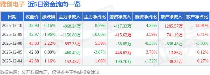 证券之星消息,截至2025年12月10日收盘,雅创电子(301099)报收于42.9元,下跌0.16%,换手率2.58%,成交量2.32万手,成交额9879.25万元。