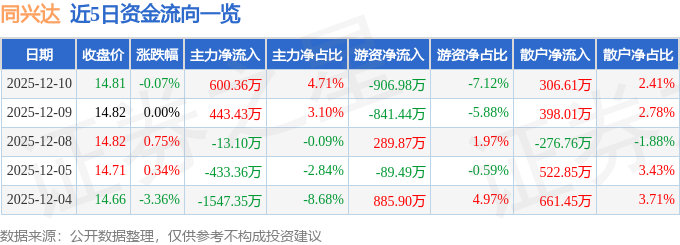 12月10日的资金流向数据方面,主力资金净流入600.36万元,占总成交额4.71%,游资资金净流出906.98万元,占总成交额7.12%,散户资金净流入306.61万元,占总成交额2.41%。