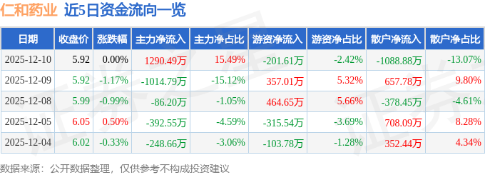 证券之星消息,截至2025年12月10日收盘,仁和药业(000650)报收于5.92元,上涨0.0%,换手率1.06%,成交量14.11万手,成交额8328.97万元。