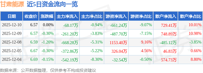 证券之星消息,截至2025年12月10日收盘,甘肃能源(000791)报收于6.57元,上涨0.0%,换手率0.57%,成交量11.11万手,成交额7290.1万元。