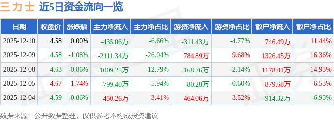 证券之星消息,截至2025年12月10日收盘,三 力 士(002224)报收于4.58元,上涨0.0%,换手率1.77%,成交量14.28万手,成交额6527.81万元。