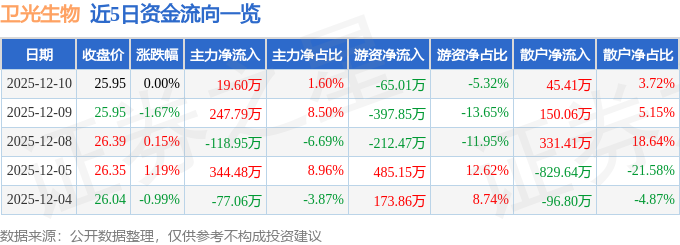 证券之星消息,截至2025年12月10日收盘,卫光生物(002880)报收于25.95元,上涨0.0%,换手率0.21%,成交量4716.0手,成交额1221.76万元。