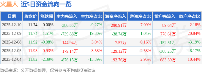 证券之星消息,截至2025年12月10日收盘,火星人(300894)报收于11.74元,上涨0.0%,换手率1.19%,成交量3.5万手,成交额4103.57万元。