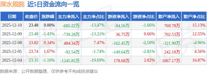 证券之星消息,截至2025年12月10日收盘,深水规院(301038)报收于23.48元,上涨0.0%,换手率0.97%,成交量2.17万手,成交额5086.81万元。