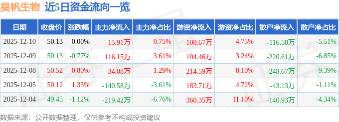 证券之星消息,截至2025年12月10日收盘,昊帆生物(301393)报收于50.13元,上涨0.0%,换手率1.0%,成交量4229.0手,成交额2117.24万元。