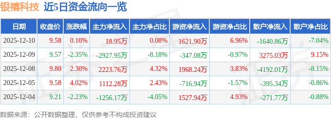 证券之星消息,截至2025年12月10日收盘,银禧科技(300221)报收于9.58元,上涨0.1%,换手率5.35%,成交量24.41万手,成交额2.33亿元。