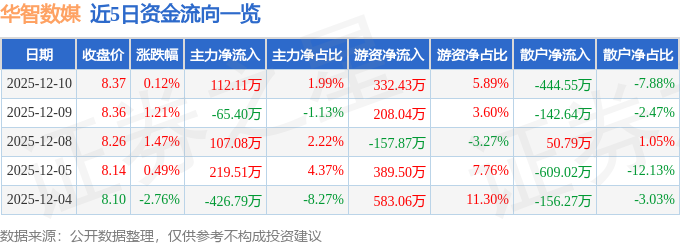 证券之星消息,截至2025年12月10日收盘,华智数媒(300426)报收于8.37元,上涨0.12%,换手率1.68%,成交量6.72万手,成交额5640.67万元。