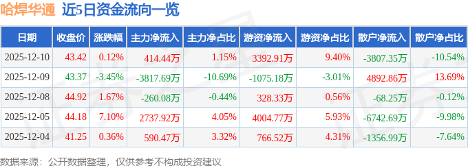 证券之星消息,截至2025年12月10日收盘,哈焊华通(301137)报收于43.42元,上涨0.12%,换手率4.59%,成交量8.26万手,成交额3.61亿元。
