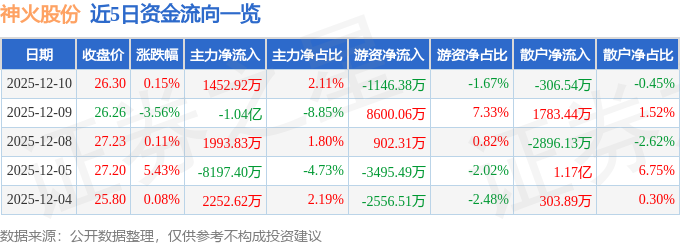 证券之星消息,截至2025年12月10日收盘,神火股份(000933)报收于26.3元,上涨0.15%,换手率1.17%,成交量26.23万手,成交额6.87亿元。