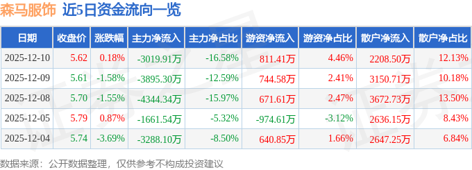 证券之星消息,截至2025年12月10日收盘,森马服饰(002563)报收于5.62元,上涨0.18%,换手率1.47%,成交量32.37万手,成交额1.82亿元。