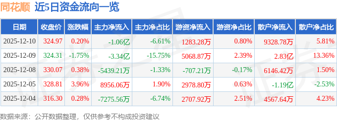 证券之星消息,截至2025年12月10日收盘,同花顺(300033)报收于324.97元,上涨0.2%,换手率1.81%,成交量4.97万手,成交额16.06亿元。