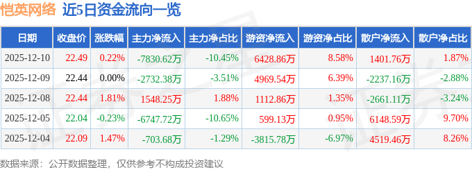 证券之星消息,截至2025年12月10日收盘,恺英网络(002517)报收于22.49元,上涨0.22%,换手率1.78%,成交量33.65万手,成交额7.49亿元。