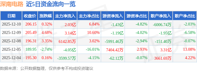 证券之星消息,截至2025年12月10日收盘,深南电路(002916)报收于206.15元,上涨0.32%,换手率2.16%,成交量14.34万手,成交额29.66亿元。