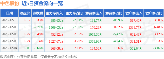 证券之星消息,截至2025年12月10日收盘,中色股份(000758)报收于6.12元,上涨0.33%,换手率1.1%,成交量21.8万手,成交额1.33亿元。