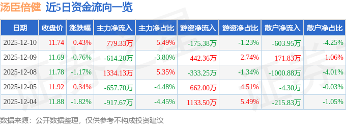 证券之星消息,截至2025年12月10日收盘,汤臣倍健(300146)报收于11.74元,上涨0.43%,换手率1.08%,成交量12.13万手,成交额1.42亿元。
