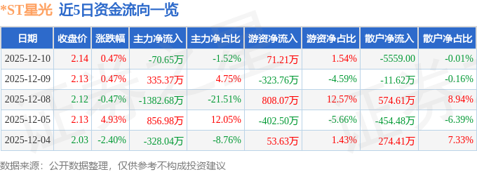 证券之星消息,截至2025年12月10日收盘,*ST星光(002076)报收于2.14元,上涨0.47%,换手率2.09%,成交量21.75万手,成交额4633.04万元。