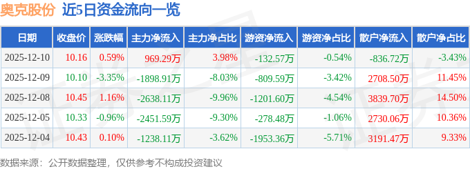 证券之星消息,截至2025年12月10日收盘,奥克股份(300082)报收于10.16元,上涨0.59%,换手率3.52%,成交量23.88万手,成交额2.44亿元。