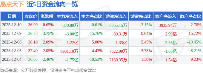 证券之星消息,截至2025年12月10日收盘,易点天下(301171)报收于36.99元,上涨0.65%,换手率10.06%,成交量38.32万手,成交额14.2亿元。