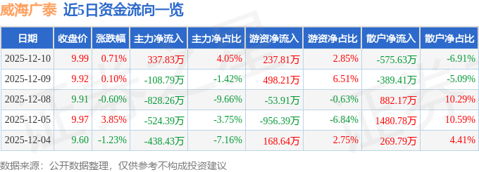 12月10日的资金流向数据方面,主力资金净流入337.83万元,占总成交额4.05%,游资资金净流入237.81万元,占总成交额2.85%,散户资金净流出575.63万元,占总成交额6.91%。
