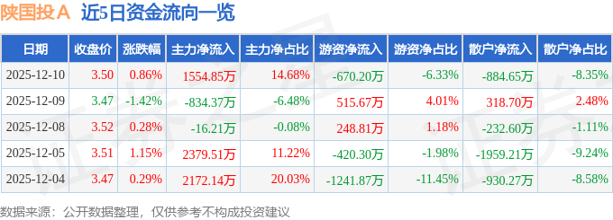 证券之星消息,截至2025年12月10日收盘,陕国投A(000563)报收于3.5元,上涨0.86%,换手率0.6%,成交量30.53万手,成交额1.06亿元。