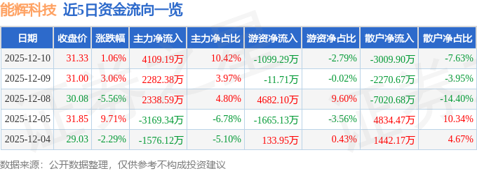证券之星消息,截至2025年12月10日收盘,能辉科技(301046)报收于31.33元,上涨1.06%,换手率10.37%,成交量12.79万手,成交额3.94亿元。