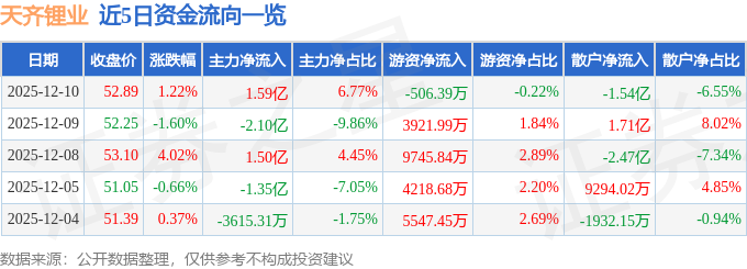 证券之星消息,截至2025年12月10日收盘,天齐锂业(002466)报收于52.89元,上涨1.22%,换手率3.03%,成交量44.65万手,成交额23.53亿元。