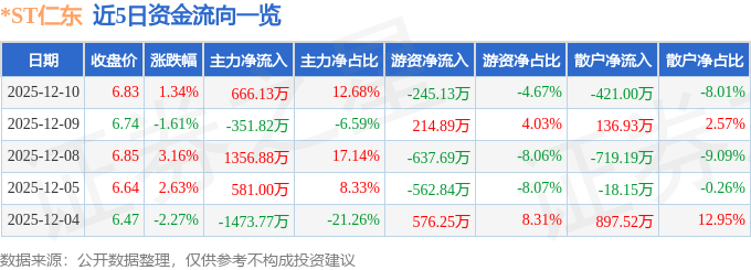 证券之星消息,截至2025年12月10日收盘,*ST仁东(002647)报收于6.83元,上涨1.34%,换手率1.14%,成交量7.74万手,成交额5253.25万元。