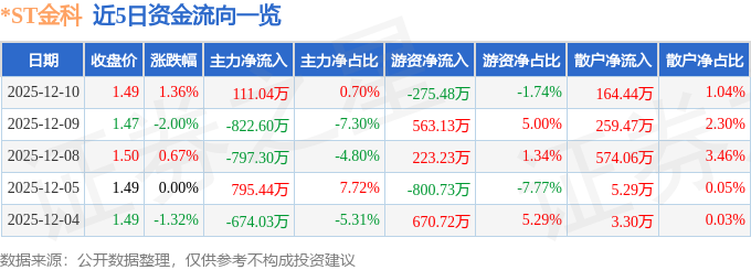 证券之星消息,截至2025年12月10日收盘,*ST金科(000656)报收于1.49元,上涨1.36%,换手率1.4%,成交量106.91万手,成交额1.59亿元。