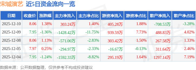 证券之星消息,截至2025年12月10日收盘,宋城演艺(300144)报收于8.06元,上涨1.38%,换手率1.14%,成交量26.8万手,成交额2.16亿元。