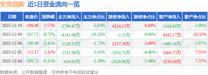 证券之星消息,截至2025年12月10日收盘,安克创新(300866)报收于109.4元,上涨1.57%,换手率1.52%,成交量4.6万手,成交额4.98亿元。