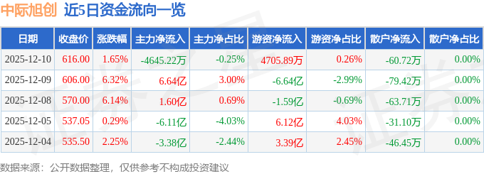 证券之星消息,截至2025年12月10日收盘,中际旭创(300308)报收于616.0元,上涨1.65%,换手率2.73%,成交量30.21万手,成交额183.13亿元。