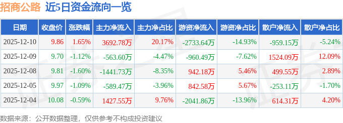 证券之星消息,截至2025年12月10日收盘,招商公路(001965)报收于9.86元,上涨1.65%,换手率0.28%,成交量18.69万手,成交额1.83亿元。