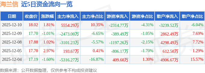 证券之星消息,截至2025年12月10日收盘,海兰信(300065)报收于18.02元,上涨1.81%,换手率4.57%,成交量29.99万手,成交额5.37亿元。
