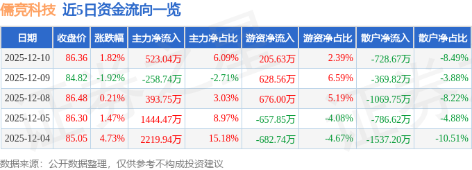 证券之星消息,截至2025年12月10日收盘,儒竞科技(301525)报收于86.36元,上涨1.82%,换手率2.03%,成交量1.0万手,成交额8586.56万元。