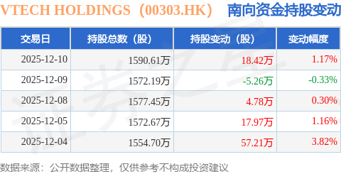 证券之星消息,12月10日南向资金增持18.42万股VTECH HOLDINGS(00303.HK)。近5个交易日中,获南向资金增持的有4天,累计净增持93.12万股。近20个交易日中,获南向资金增持的有16天,累计净增持140.43万股。截至目前,南向资金持有VTECH HOLDINGS(00303.HK)1590.61万股,占公司已发行普通股的6.28%。
