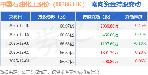 证券之星消息,12月10日南向资金增持2980.8万股中国石油化工股份(00386.HK)。近5个交易日中,获南向资金增持的有3天,累计净增持3418.6万股。近20个交易日中,获南向资金增持的有16天,累计净增持2.43亿股。截至目前,南向资金持有中国石油化工股份(00386.HK)66.97亿股,占公司已发行普通股的27.96%。