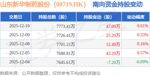 证券之星消息,12月10日南向资金增持47.0万股山东新华制药股份(00719.HK)。近5个交易日中,获南向资金增持的有4天,累计净增持120.6万股。近20个交易日中,获南向资金减持的有10天,累计净减持157.2万股。截至目前,南向资金持有山东新华制药股份(00719.HK)7773.41万股,占公司已发行普通股的39.86%。