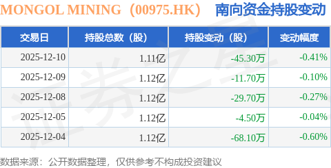 证券之星消息,12月10日南向资金减持45.3万股MONGOL MINING(00975.HK)。近5个交易日中,获南向资金减持的有5天,累计净减持159.3万股。近20个交易日中,获南向资金减持的有15天,累计净减持435.9万股。截至目前,南向资金持有MONGOL MINING(00975.HK)1.11亿股,占公司已发行普通股的10.65%。
