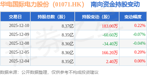 证券之星消息,12月10日南向资金增持183.0万股华电国际电力股份(01071.HK)。近5个交易日中,获南向资金增持的有3天,累计净增持256.6万股。近20个交易日中,获南向资金减持的有9天,累计净减持1139.6万股。截至目前,南向资金持有华电国际电力股份(01071.HK)8.37亿股,占公司已发行普通股的48.74%。